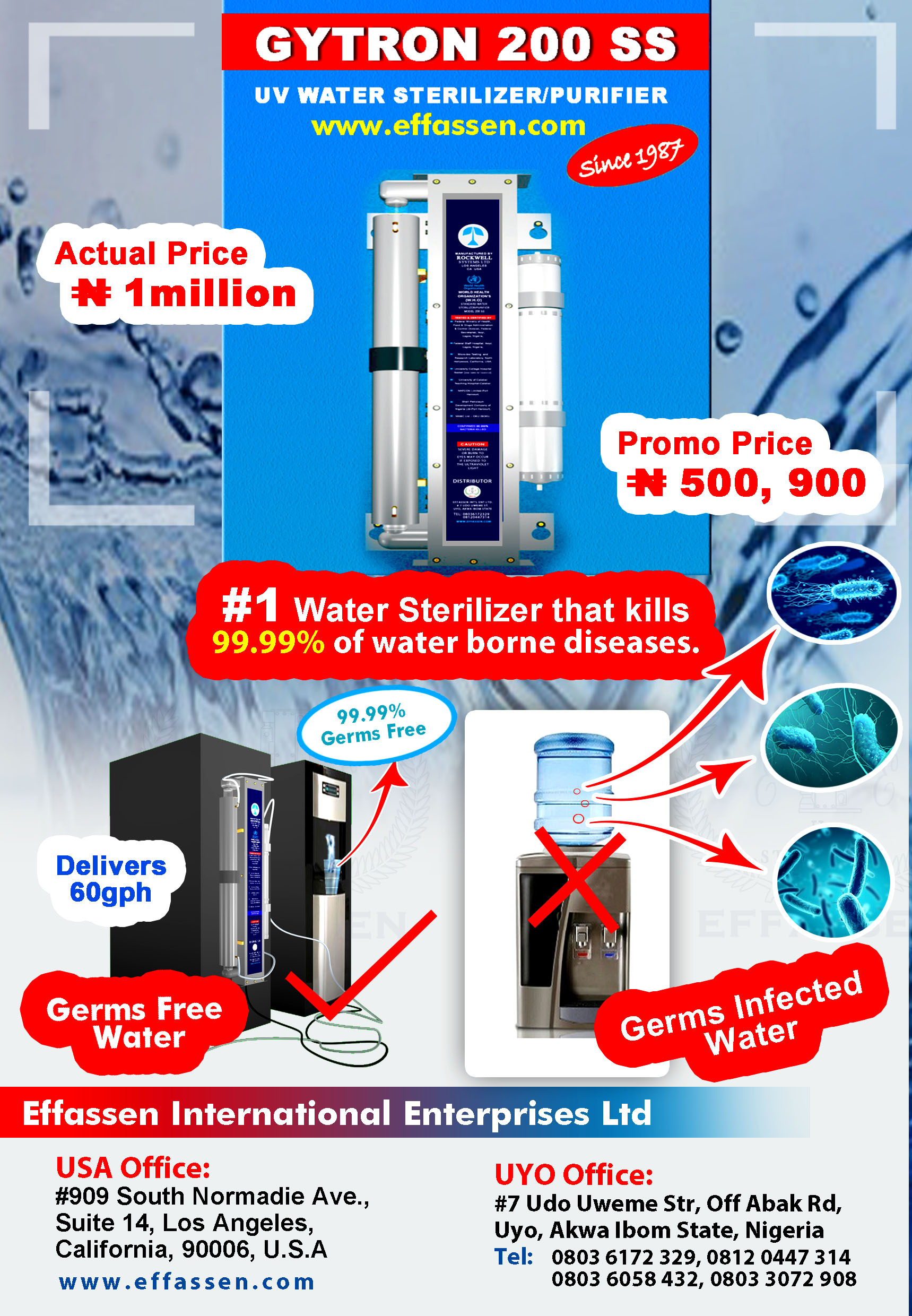 The Water Sterilizer Pro is the latest innovation from Effassen International Enterprises Limited, a world renowned Water Treatment and Purifying company. The Water Sterilizer Pro was tested and certified by various accredited institutions and laboratories around the world, is capable of killing 99.99% of water borne diseases. It has capacity to process